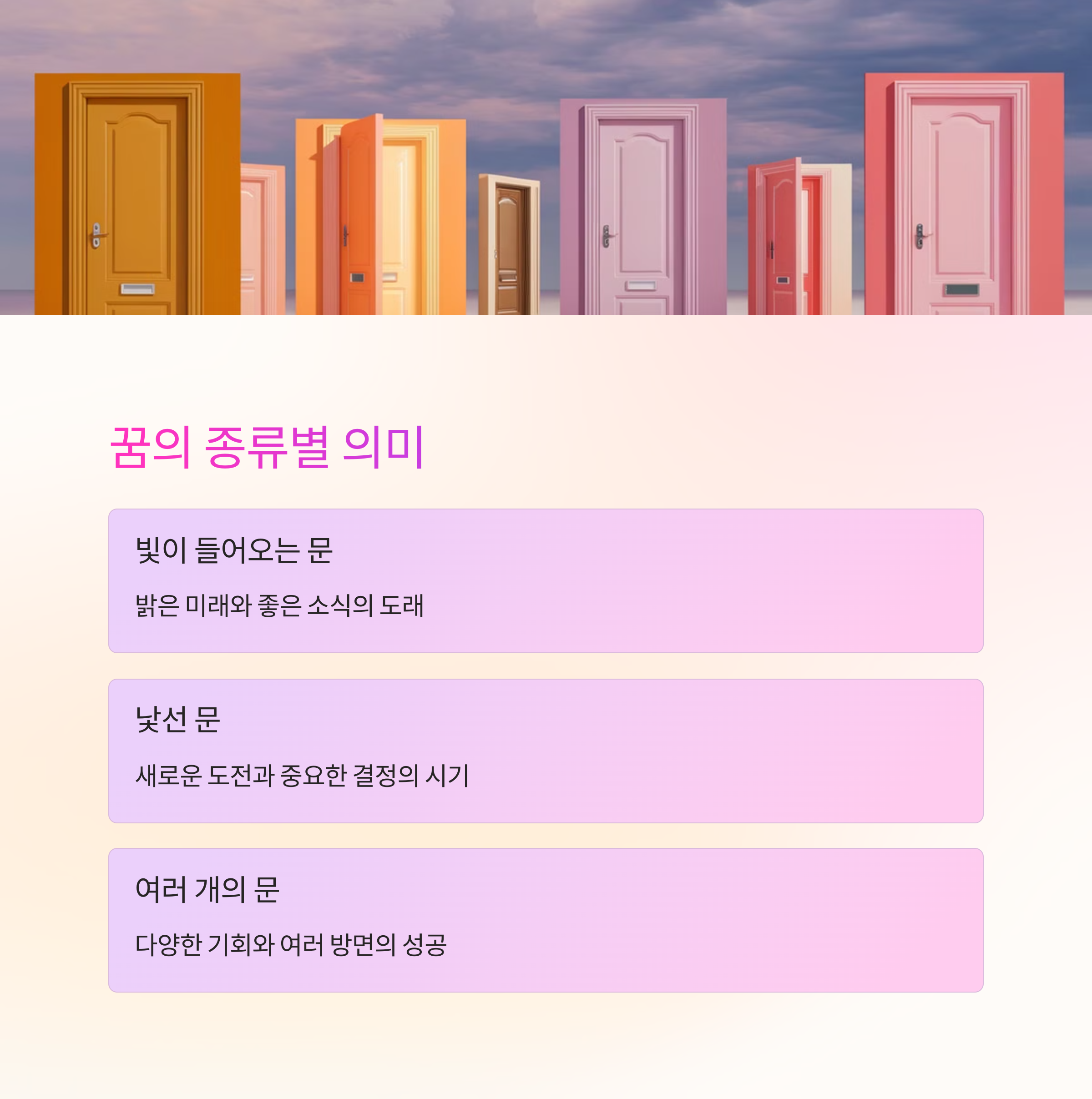 - 여러 개의 문을 여는 꿈 다양한 기회가 생기고 여러 방향에서 성공할 가능성이 있음