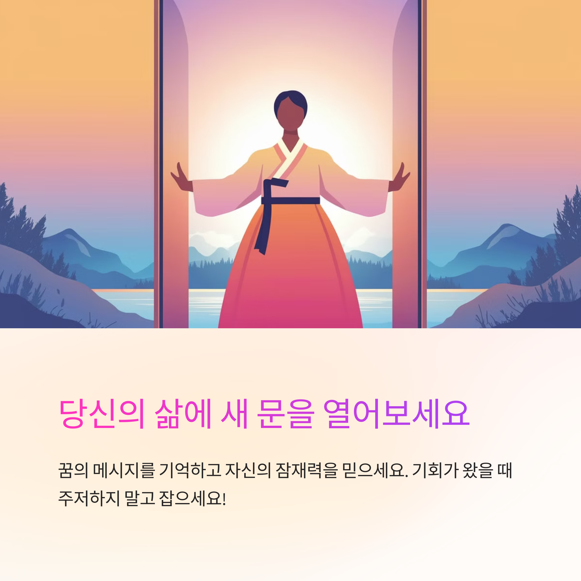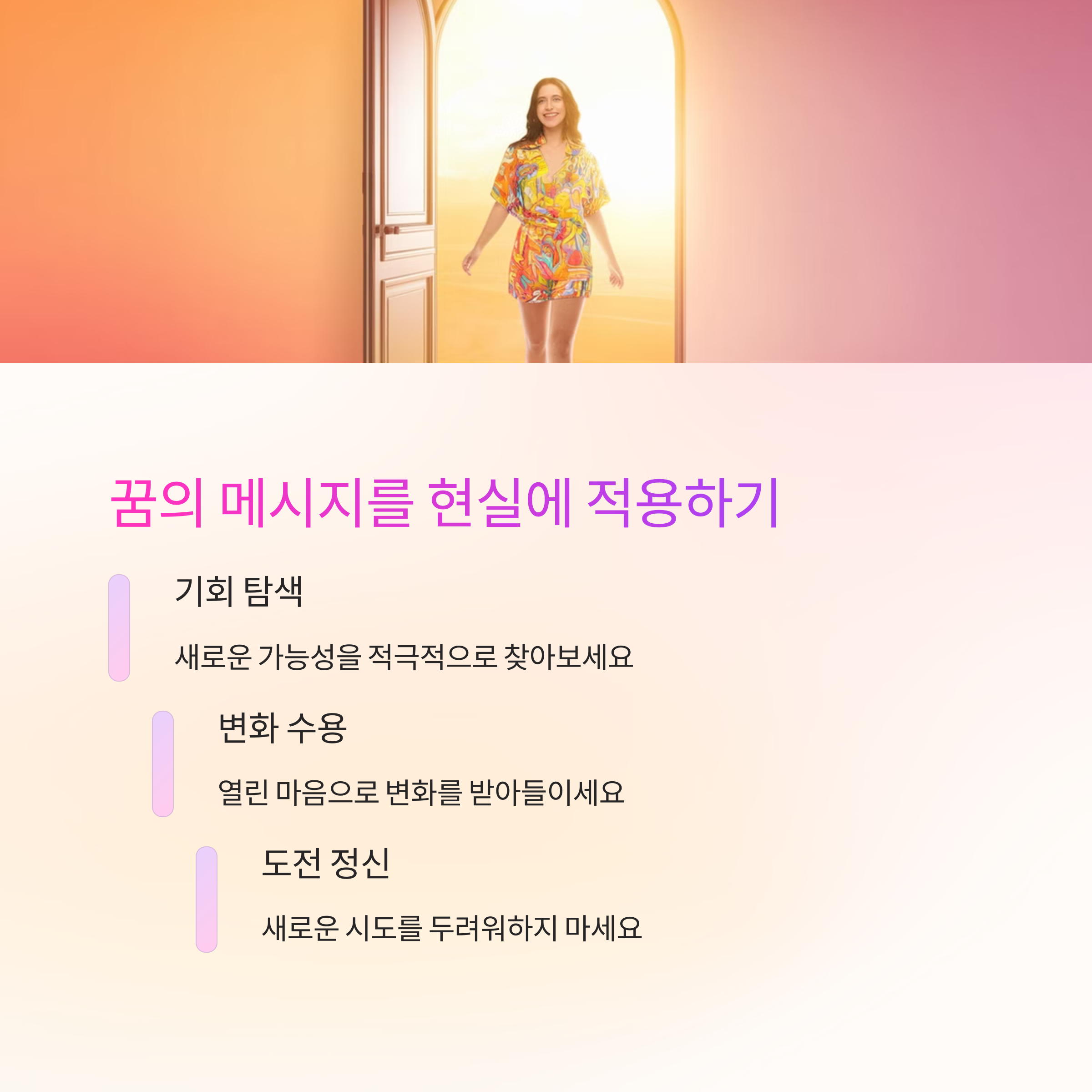 문을 활짝 여는 꿈은 새로운 기회가 찾아오고 행운이 따를 가능성이 높은 길몽이다. 이를 현실에서 활용하려면 열린 마음으로 변화를 받아들이고 새로운 도전에 적극적으로 임하는 것이 중요하다.